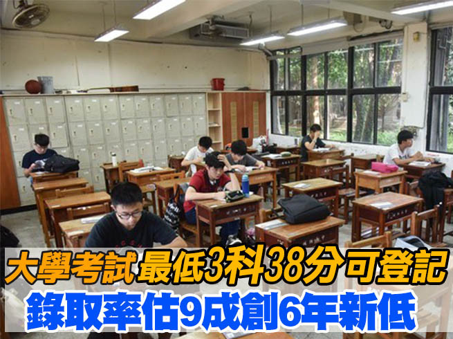 107年大學指考成績今(19)日出爐,大學考試入學分發委員會中午公布考試入學分發管道最低登記標準,採計「英文、數甲、化學」3考科,且原始總分合計達38分就可參與志願登記。分發會也預估,今年分發錄取率約9成左右,是過去六年來的新低,分析與招生名額減少、龍年人數較多有關。