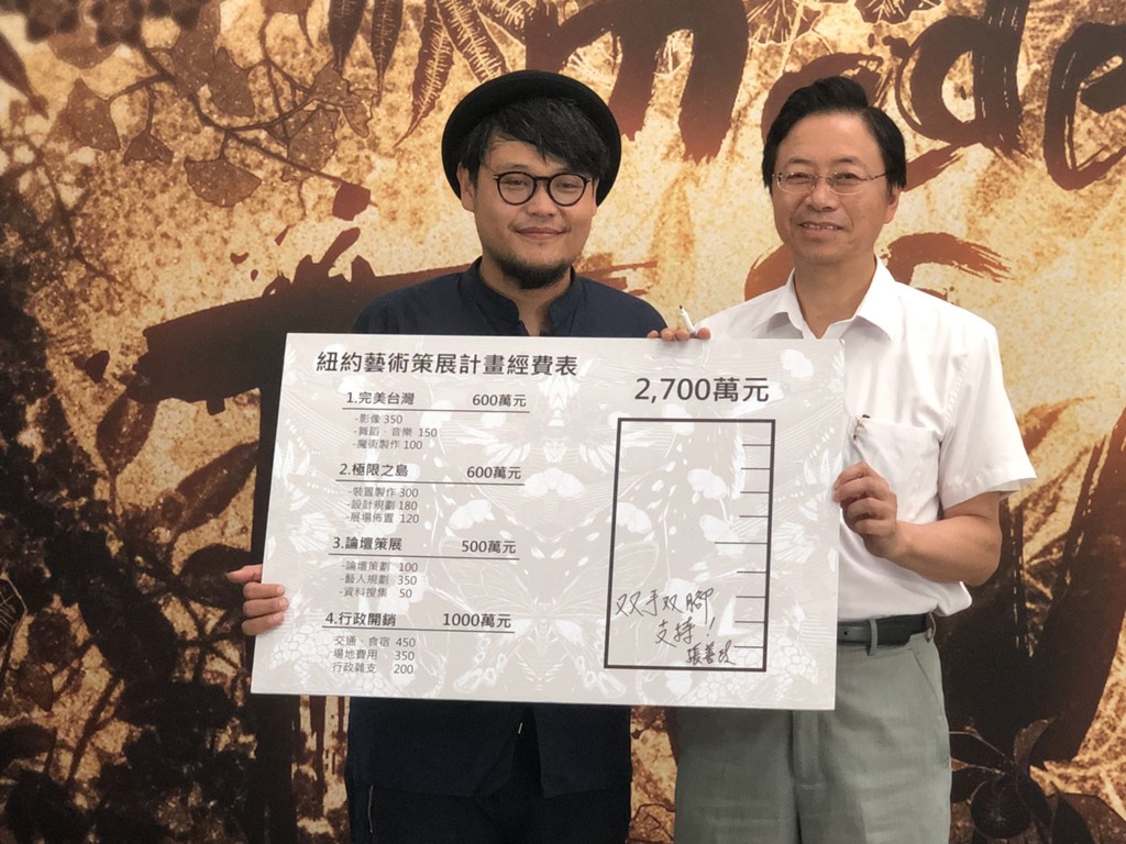 只是前往紐約策展所需經費相當可觀,張善政也現場響應募款,還寫下雙手雙腳支持,他說,希望透過拋磚引玉讓台灣各界可以共襄盛舉,也預祝他們這次順利成功。