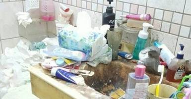 從原PO在「爆廢公社二館」貼出的照片可以看到,廁所內的洗手台上堆滿東西,使用過的洗面乳、卸妝乳隨便亂丟,透明玻璃杯都已經變成灰黑色。更恐怖的是,洗手台內積了厚厚一層黑垢,下方2個垃圾桶內的衛生紙滿到溢出來,馬桶右邊也有衛生紙堆成的垃圾山。