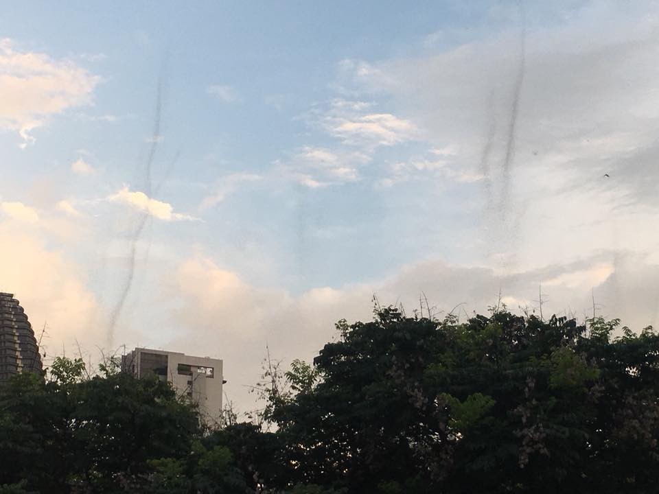 從民眾提供的照片可以清楚看到,時間接近下午傍晚左右,在朝馬運動中心前的天空中,出現數個比周邊建築還要高的「蟲龍捲」,蟲子的真實身分不清楚,但密密麻麻又灰灰黑黑的蟲子們,在蔚藍的天色中格外顯眼。