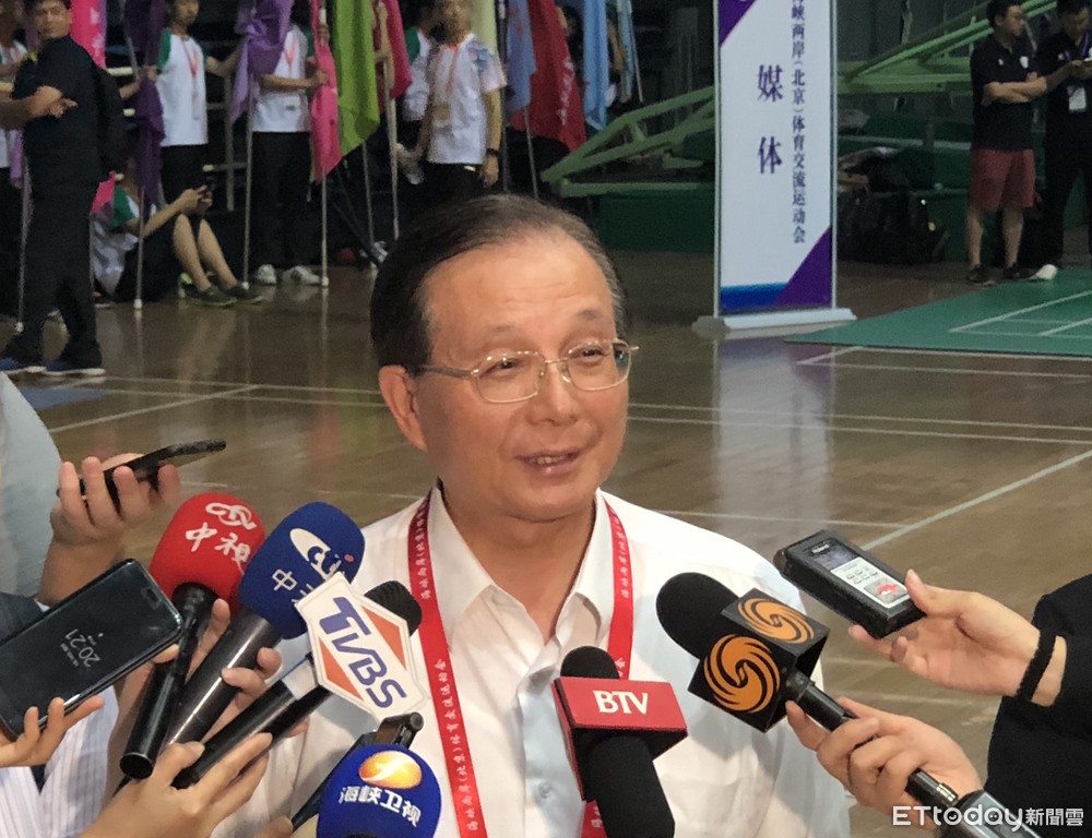 ▲大陸國台辦副主任龍明彪(球場左)為海運會羽球賽開球。(圖/記者曾俊豪攝)