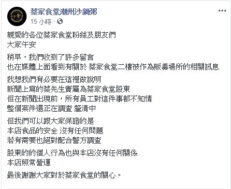 警方獲報後直搗黃龍,查扣毒品安非他命等毒品,總計100多公克,市值約30萬元。蔡男落網後,「蔡家食堂潮州砂鍋粥」粉絲專頁發聲明澄清表示,蔡男指是店內股東之一,個人行為與該店無關。