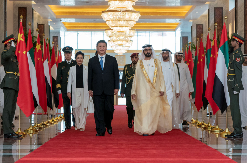 接著,習近平和彭麗媛在穆罕默德副總統兼總理、穆罕默德王儲的陪同下前往檢閱大廳,儀仗隊列隊迎候。鳴21響禮炮。習近平和彭麗媛同穆罕默德副總統兼總理共同登上檢閱台,軍樂隊奏起義勇軍進行曲。奏樂完畢後,習近平和彭麗媛在穆罕默德副總統兼總理、穆罕默德王儲陪同下前往會見廳,同阿聯主要內閣部長和重要王室成員等阿方迎接人員握手。穆罕默德副總統兼總理、穆罕默德王儲同中方陪同人員握手,雙方展開交談。