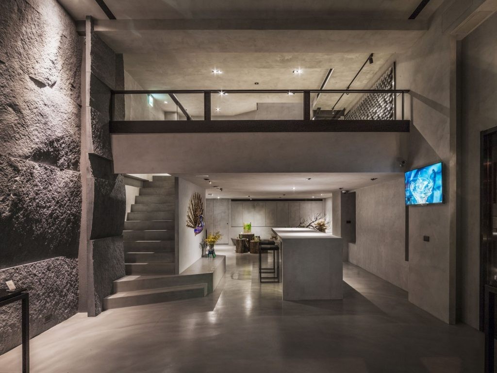 為回應每件產品獨特的藝術價值與獨到創意,從珪藻土、石皮、PANDOMO等材料相互連貫的紋理,皆俱寂共賞,以自然成就的空間狀態,承載當代藝術的創意所需。灰色的彩度由著天地壁相連的線面間取得和諧印象,脈絡相承且自成一格。