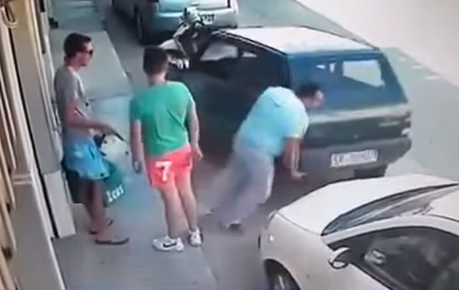 據《每日郵報》報導,一名身穿長褲的男子起初先是把車門打開,看似想把車子開走,但他突然發現車子前後的距離似乎不太夠,因為車前卡了一輛摩托車,而後方的車輛好像跟車尾靠得太近。此時,人行道上有2名身穿短褲的男子正在聊天。