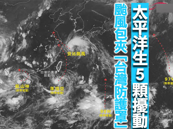 中央氣象局表示,熱帶低壓最快22日清晨發展為今年第11號輕度颱風「悟空」(WUKONG),同時可能發布海上警報,預計它有往東修正,通過巴士海峽後將北轉,陸警機率較低,但午後各地山區及大台北局部大雨警戒;至於10號颱風「安比」則將往浙江一帶登陸。氣象專家觀測發現,目前有5個熱帶系統排排站,相當熱鬧,但台灣很幸運都只是被擦過「台灣防護罩啟動中」!