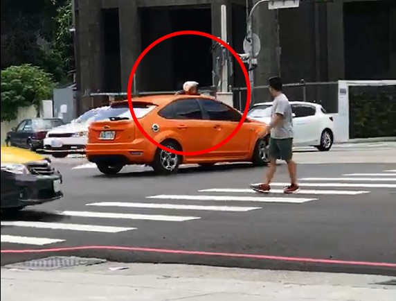 從男網友PO在臉書「爆料公社」影片可見,橘色轎車往對街緩緩行駛過去,而且似乎有受到極大的撞傷,右邊車門還凹了一大塊;但最令人矚目的是,轎車前擋風玻璃上趴著一名戴著安全帽的男子,雙腳還使力硬撐在引擎蓋上,頭不斷四處回頭看,彷彿在說「我是誰?我在哪裡?」但車子好像沒有看他一樣,一路往前開。