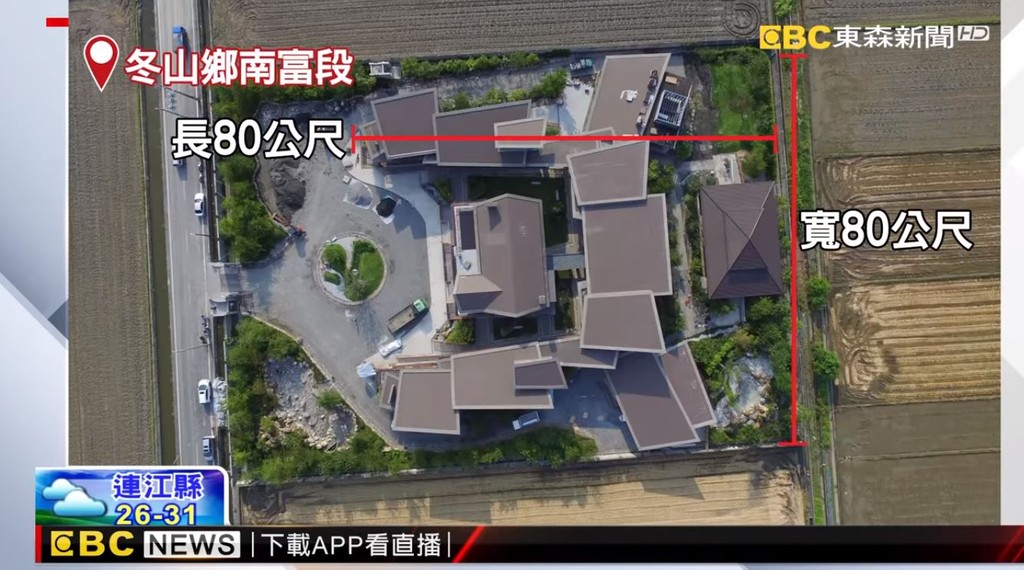 按照法規,如果建築的違規面積落在1000到3000平方公尺,就會對地主開罰。據了解,位在冬山鄉南富段的「飛機農舍」違規面積達2600平方公尺,地主最初申請時,農舍都是分開的,後來才暗自改變構造,連旁邊的圍牆也跳過合法的申請步驟。