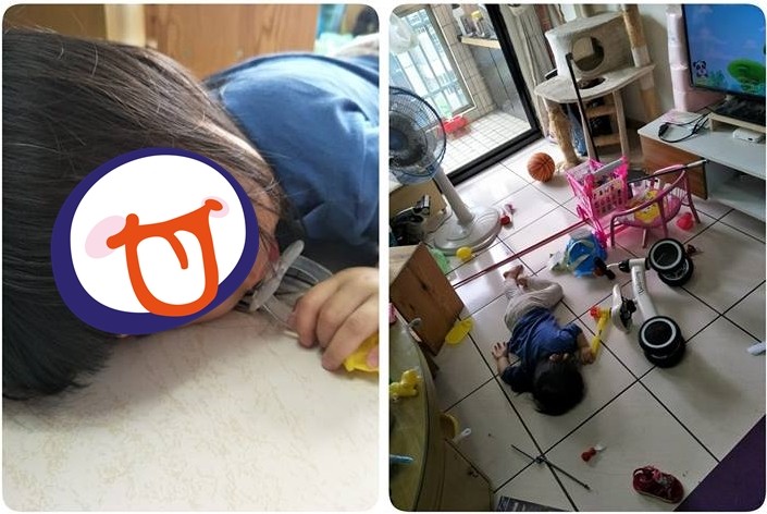 不知道大家小時候有沒有類似經驗。臉書社團「爆怨公社」有一名媽媽PO文無奈說,女兒趁她在洗碗沒注意時,竟然就把客廳弄的一團糟,而且弄亂後直接就趴在地上睡著了,畫面讓她看了好氣又好笑。其他網友看了紛紛笑說:「電量用盡,正在充電中啦……太可愛了!」