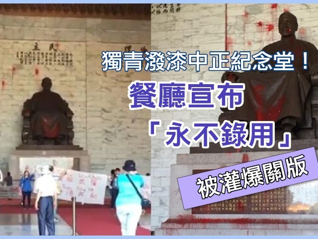 獨派青年李嘉宇、陳俞璋20日下午本應為「228慈湖陵寢潑漆」事件出庭,卻提前在上午9點30分偕3名同夥跑到中正紀念堂潑紅漆。有餐廳業者不滿他們的行逕,21日透過臉書粉專宣布:「本公司不錄用破壞社會秩序的前科職業學生」還列出過去參與類似事件的8名青年學生,引發網友熱議;目前該餐廳粉專已經關閉。