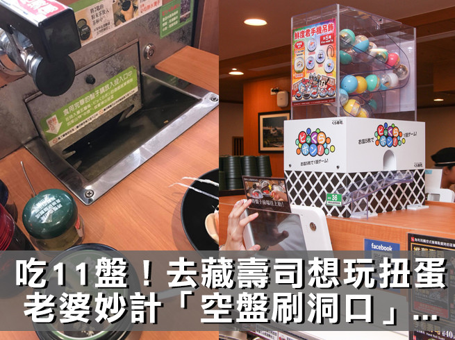 日本連鎖迴轉壽司品牌「藏壽司」近來積極在台灣展店,獨特的扭蛋遊戲更是風靡饕客,只要投入5盤就有機會獲得精美小禮物,讓人忍不住吃更多盤。昨日就有對夫妻用餐,吃到第11盤時,丈夫心想還要再努力4盤才有抽獎機會,沒想到古靈精怪的老婆想出秘招,拿起空盤在回收口來回刷,最後收到帳單悲劇了。