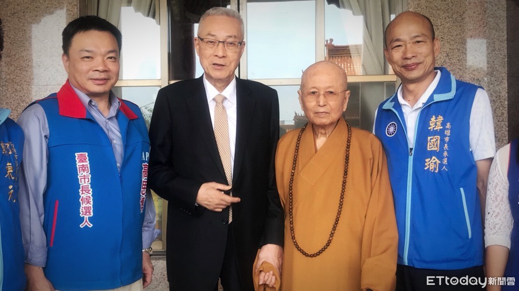 ▲國民黨提名的台南巿長參選人高思博、高雄巿長參選人韓國瑜,陪同國民黨主席吳敦義,前往高雄市阿蓮區光德寺淨心長老祝壽。(圖/高思博提供)