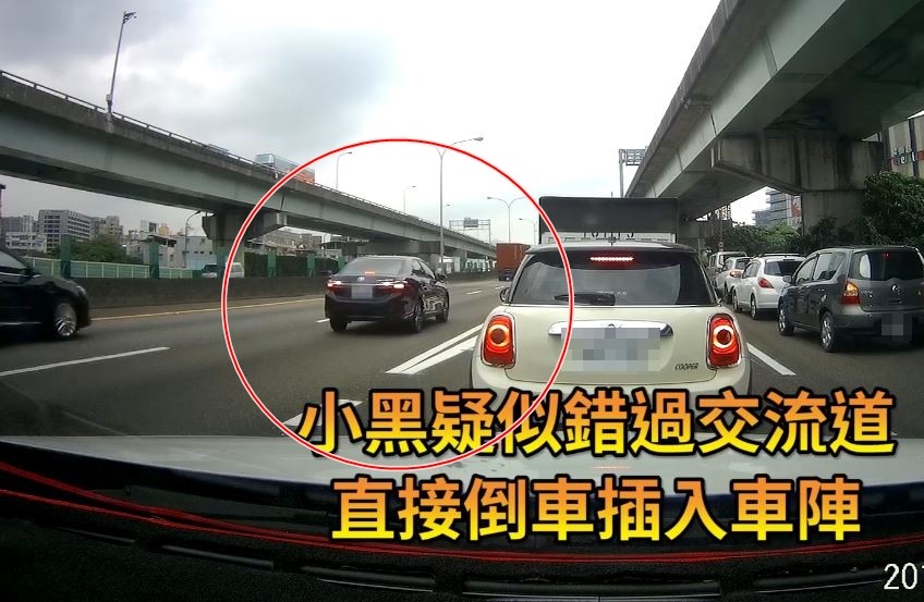 影片發生在國道一號北上內湖路段,當時剛好是上班的尖峰時段,許多駕駛正排隊等待下交流道,結果就有一輛黑色轎車疑似錯過交流道,直接在車道上倒車硬擠插入排隊車陣。警察局小編就直言說:「這樣倒車插隊,會不會太誇張?錯過交流道還有下一個,倒車、跨槽化線、暫停通通不行,不罰你還有天理嗎!」