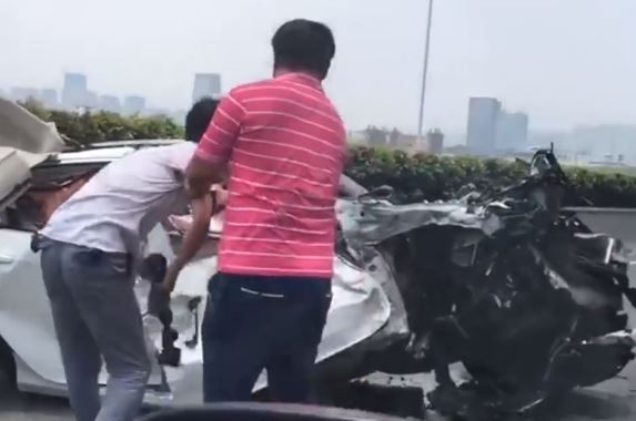 影片中,只見白色小轎車高速奔馳在高速公路上,下一秒卻因為閃避不及撞上前方大貨車的車尾,加上雙方的車身高度差距大,轎車的前半部車頂當場被削掉,車頭也嚴重毀損變形,雖然駕駛幸運沒有受到太大的傷害,副駕駛座的乘客卻受困在變形的車內。