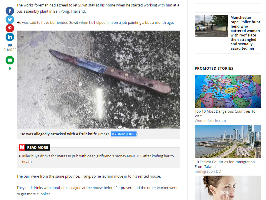 50歲的泰國男子佩特皮薩特(Permsak Petprasert)日前與朋友外出返家後,為了保護差點受到侵害的老婆,一氣之下竟拿著水果刀,將39歲老闆蘇維特(Suwit)的生殖器切下,並丟入一旁的草叢裡。