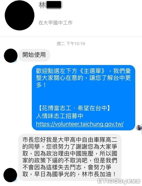 ▲大甲高中自由車隊選手私訊市長林佳龍,表示不會因中國打壓而喪失鬥志,希望市府能繼續努力爭取,讓他能為國爭光。(圖/台中市政府提供)