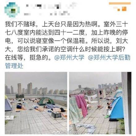 鄭州大學學生23日在微博貼出學生集體睡天台的照片,這讓鄭州校園的官方微博也忍不住轉發,並且打趣寫到,「我們不賭球,上天台只是因為熱,7月22日鄭州大學 不少學生為避暑,紛紛帶著涼蓆被褥到樓頂天台打地鋪過夜,還有學生在樓頂支起帳篷睡覺。連日來,鄭州市遭遇高溫酷暑天氣,恰巧該棟樓又逢斷電,學生們為了能夠順利入睡,便出此奇招,在寢室或樓頂打地鋪過夜。」