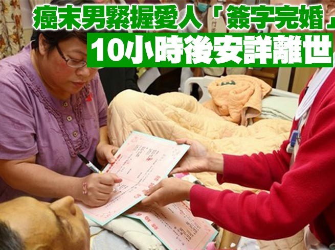 花蓮一名50歲癌末翁姓男子24日在醫護人員的見證下,和交往7年的鄭姓女友完婚。小女兒貼心地奉上親手繪製的畫作堅強地說,「痛痛飛飛,爸爸就不痛了」。10個小時後,翁男安詳地閉上雙眼離世,讓人欣慰的是,他的人生最後階段充滿著愛和溫暖。