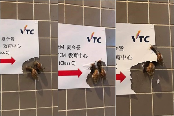 一點一滴,全部吃光光!一名香港網友在臉書爆廢公社PO出照片,表示學校近日舉辦夏令營,還印了A4紙貼在廁所牆上指示動線,但原PO卻意外發現,牆上竟然趴了2隻大蝸牛,蠶食鯨吞將A4紙一角吃個精光,就連印有LOGO的部分也快要遭殃。