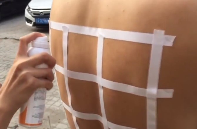 30歲的周男為了幫老婆測試哪一種防曬用品比較有效,23日自告奮勇脫掉上衣,並用膠帶在背上貼出九宮格區隔,再由老婆將9種防曬用品分別塗抹在格子裡,最後跑到太陽底下「曬」了整整2小時,就算熱到汗流浹背也沒有抱怨。