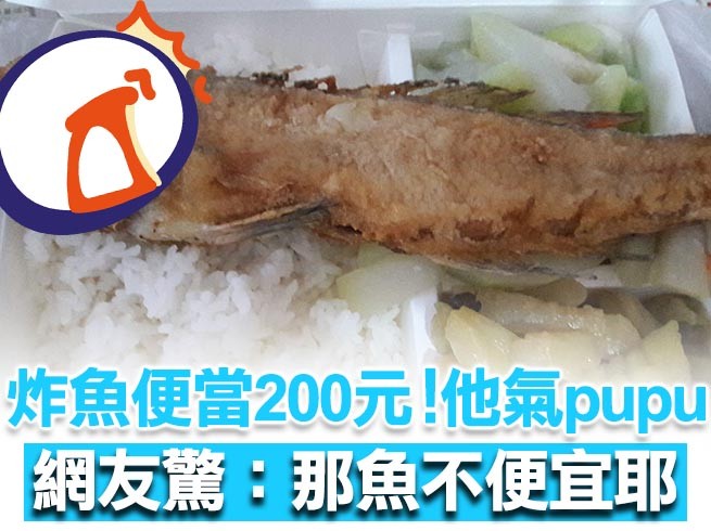 網友貼出照片,只見這個便當的配菜有瓠瓜、苦瓜等蔬菜,主菜則是一整條炸魚,下面則鋪了滿滿的白飯,但原PO卻直抱怨,這個便當竟然要200元。和一般上班族購買的午餐比看看,一主菜三配菜的盒餐價格約落在70至100元,這個炸魚便當確實貴了一倍。
