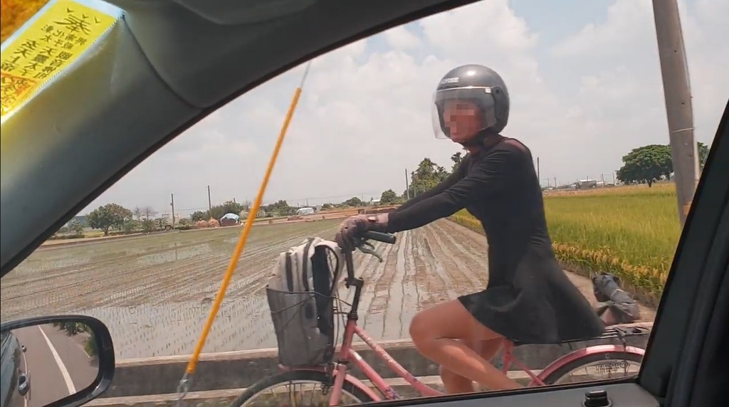 彰化縣行善功德會長廖守豐25日在臉書上po出一段影片,畫面上一名「美腿短裙妹」身材苗條又穿著短裙,但卻帶著安全帽騎車,引發他的好奇心,超車想一睹芳容,不料,回過頭一看,對方竟是一名阿伯,嚇得他崩潰直喊:「快昏倒」、「我要油門催下去趕緊跑」。