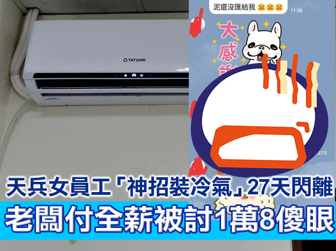 一名老闆在臉書發文,表示新來女員工自作主張在他辦公室裝冷氣,還向他追討1萬8千元的費用。雖然他被蒙在鼓裡,但後來心想冷氣畢竟用得到,允諾支付費用,只是女員工先前曾預支1萬元薪資,裝完短短幾天又提出離職,他不禁反問「那妳借支的錢怎麼辦」。沒想到對方不斷轉移話題,還回「是你自己要借我的」讓他頭痛不已,因此發文請益大家該怎麼處理。文章一出,女員工也PO文討拍,反過來指控遭老闆公審,卻遭網友一面倒灌爆,大罵她實在太誇張。
