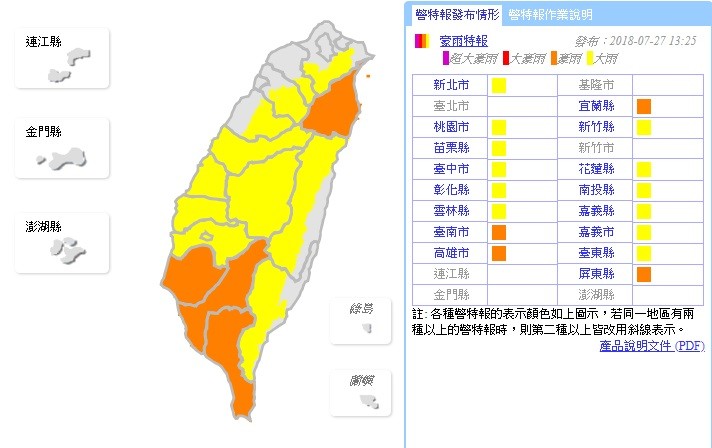 氣象局持續發布豪雨、大雨特報,其中宜蘭縣及嘉義縣山區升級豪雨特報。