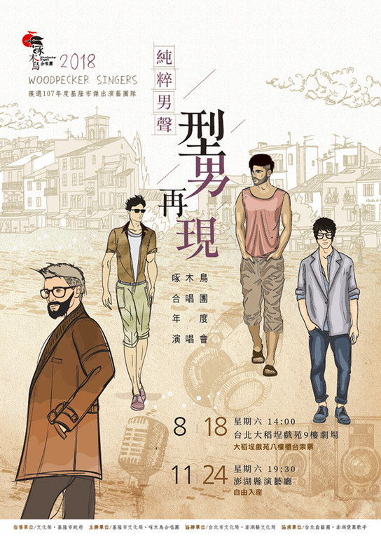 2017年,基隆啄木鳥合唱團透過「純粹男聲」的演出,投射真實的生活寫照,擴展人們對於型男的多元定義;而在2018年,啄木鳥將走出基隆,帶領其他縣市觀眾也能感受文青男、暖男、宅男與台客男等四類男性的特質。首場將於8月18日下午在具有歷史文化的大稻埕演出,在聆聽美妙歌聲之餘,還能規劃一趟輕旅行。