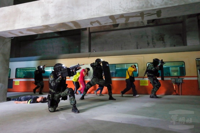 此次「反恐制變實兵演練」模擬武裝分子占領透天住宅和地下車站的處置作為,以磨練幹部反應與部隊執行力,進而發揮限制空間戰鬥演練(CQB)特性兵力編組區分突擊組、掩護組及支援組,運用煙幕及優勢火力突襲目標,遂行人質救援任務。
