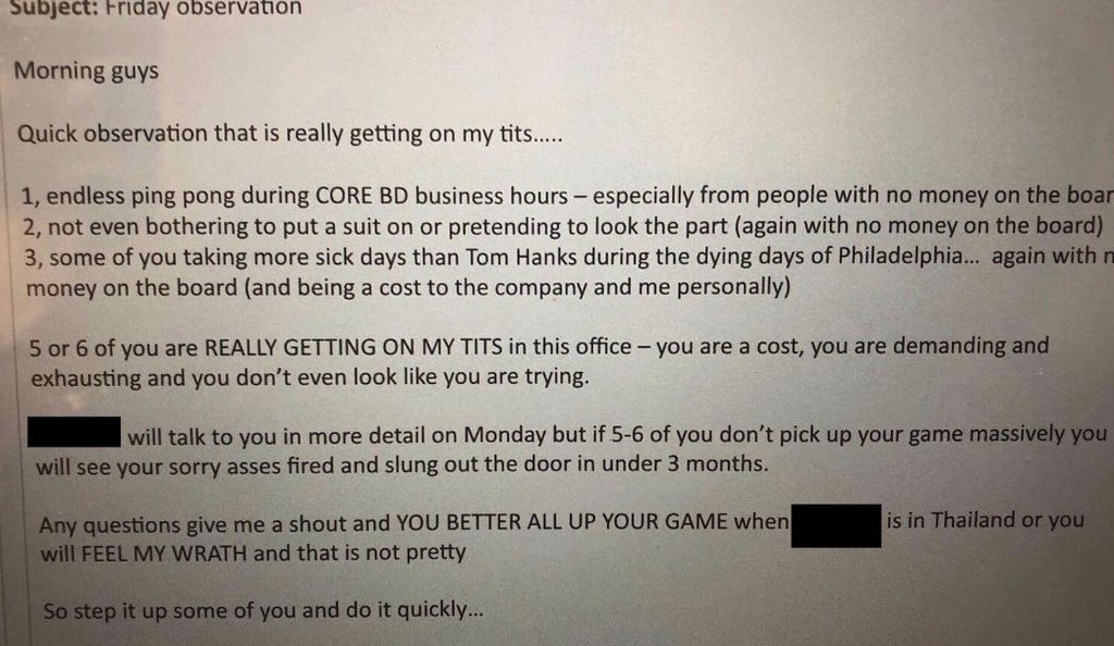 據《衛報》報導,伍德透過郵件嚴厲指責,員工趁著大老闆不在時無止盡的打拼乓球,也沒穿西裝或是「假裝有在工作」,請的病假比演員湯姆漢克斯(Tom Hanks)在電影《費城》(Philadelphia)飾演的愛滋病患還多。他警告,職員的薪水對公司與他來說都是「損耗」,令人筋疲力竭。