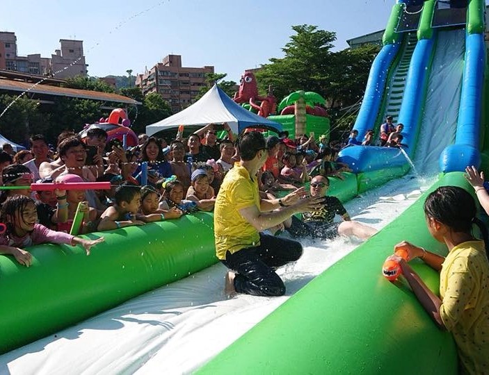 影片中可以看見,江俊霆與朱立倫一起參加五股水樂園活動,並且親自下場玩水與民眾一起同樂,但當朱立倫優先滑下滑水道後,還沒來得及站起來就被江俊霆撞飛,「我剛把市長當保齡球打,直接撞飛,而且姿勢……。」場面讓現場民眾紛紛大笑,朱立倫也笑得非常開心。
