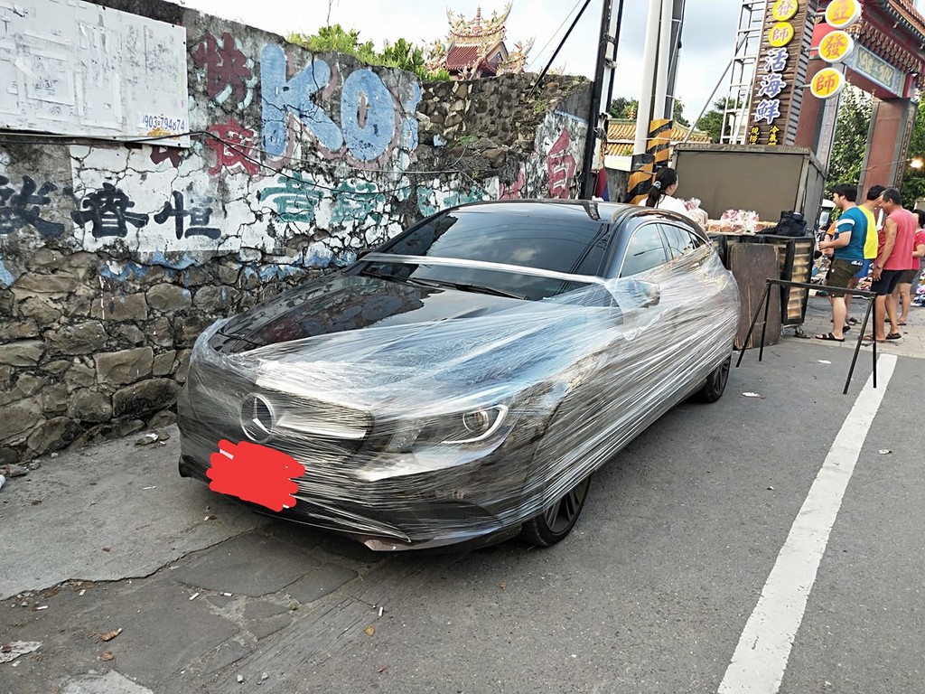 網友留言寫道,「麻煩到墾丁(應為恆春)給擺攤的大哥大姐們一個機會,不要亂停車拜託,你看人家怕刮到你的車還要保護你的車」。從照片中顯示,此賓士車的車邊遭到「封膜」處理,纏了好幾層的保鮮膜,後方店家招牌還意外入鏡,是恆春某間海鮮餐廳。