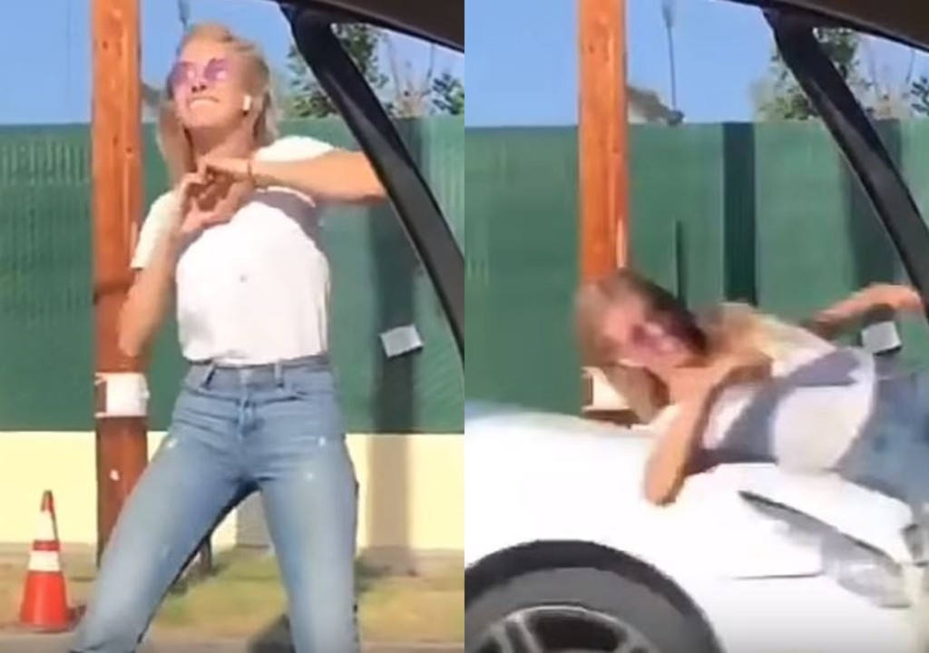 ▲ 全球瘋「Kiki挑戰」跳車飆舞,金髮女笑著被車高速撞飛。(圖/翻攝自YouTube)