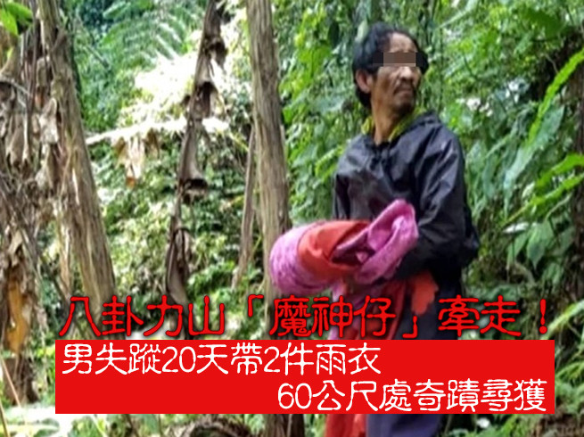 苗栗南庄一名55歲潘姓男子擔心養殖魚場水源受影響,在7月11日瑪莉亞颱風襲台當天,獨自上八卦力山巡查水源,不料自此音訊全無。期間警消雖出動大批人力多次搜山,但20天來一無所獲,讓親友飽受折磨,一度認為潘男遭「魔神仔」牽走。無奈之下,家屬昨日(31)請警消最後一次搜山,懷抱最後一絲希望,沒想到隊伍才剛出發,隨即尋獲潘男身影,讓搜救人員全都興奮直呼「奇蹟」。