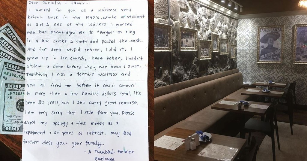 亞利桑那州土桑(Tucson)一間墨西哥餐廳日前收到一封驚喜信件,裡頭還夾帶1000美元(約台幣3萬元)。匿名的前員工寫道,她1990年代在這家餐館當服務生時,因為受到同事慫恿而偷了錢,如今,已過了20年以上,她要連帶利息把當年偷的費用歸還,「請你接受我的道歉…願上帝永遠保佑你跟家人。」