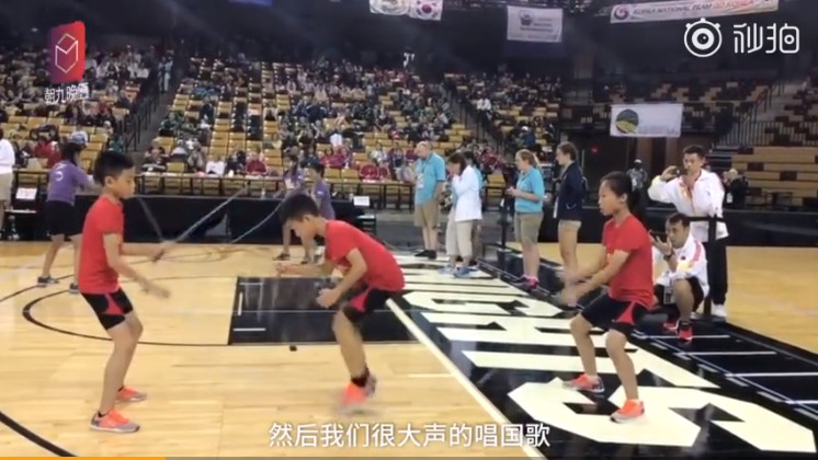 美國的跳繩世界杯賽中,中國一舉拿下23個項目的冠軍,金牌總數達50多枚。畫面中,運動場上,穿著紅色上衣與黑色短褲的3位小朋友分工合作,2人分別站在左右兩端控制跳繩頻率,中間負責跳的主將則是微彎身子,雙手騰空握拳擺放身體兩側保持平衡,眼睛緊盯繩子,左右兩腳踩踏間隔相當一致,過程中,只有傳出規律的踩踏聲,但速度快到繩子已經自動「隱身」。