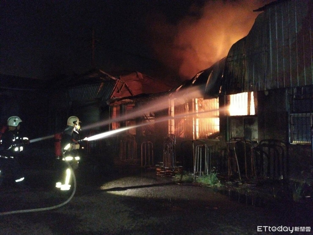 ▲台南市關廟區中山路二段1處工廠,3日凌晨發生火警,消防人員破壞鐵門全力進行搶救。(圖/記者林悅翻攝,下同)