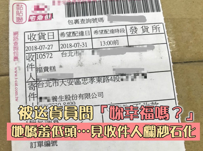 女網友說,之前聽朋友推薦「福貴糕」,家人又剛好喜歡吃傳統點心,她就下單購買,想在父親節帶回家吃。「那是一個風光明媚的午後,家裡的電鈴突然被按響『有包裹喔~』」,原PO於是打開大門讓送貨員上樓,沒想到對方一看到她,馬上問「小姐妳幸福嗎?」讓她又懵又茫然。