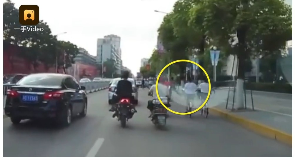 從影片中可看到,汕頭7月26日上午約8點多,一台雙載機車由左線道後方,右拐超車到右線道,之後超車經過2台單車時,後座男子竟然伸出鹹豬手,襲擊右方其中一名騎著單車的女孩。女孩一時受到驚嚇重心不穩,倒地時還牽連到另外一台單車,造成2人雙雙倒地。