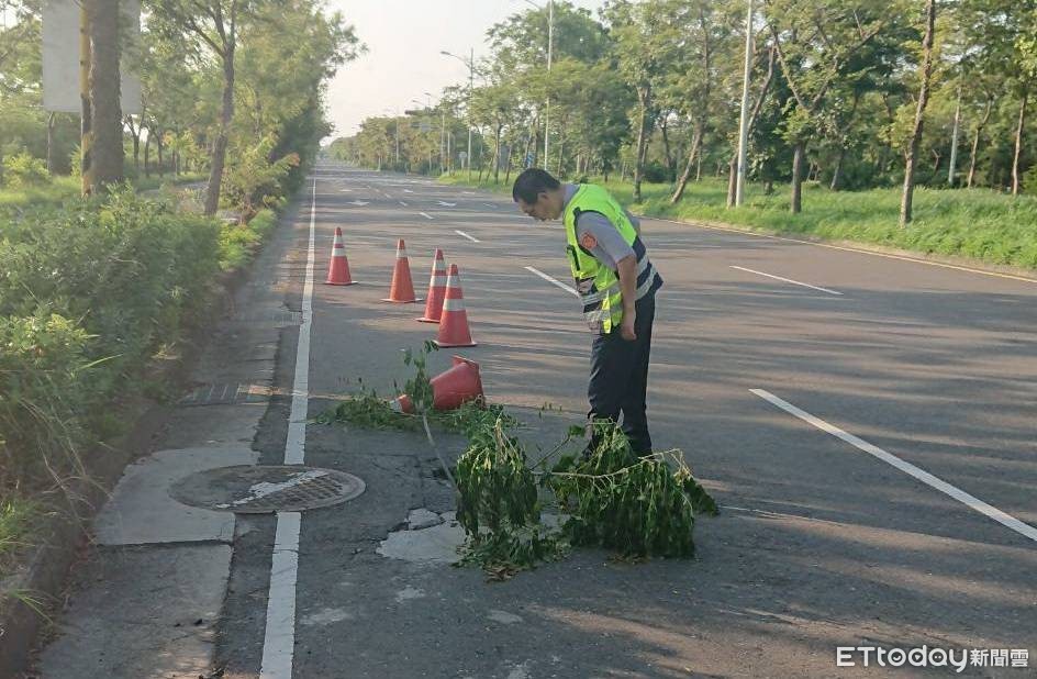 警方說,陳員擔心路過車輛再次受害,影響交通順暢,在車輛急駛的車陣中,將巡邏車上的三角錐拿下,布置於坑洞四周,一面疏導交通,一面通報區公所施工單位前來修復。