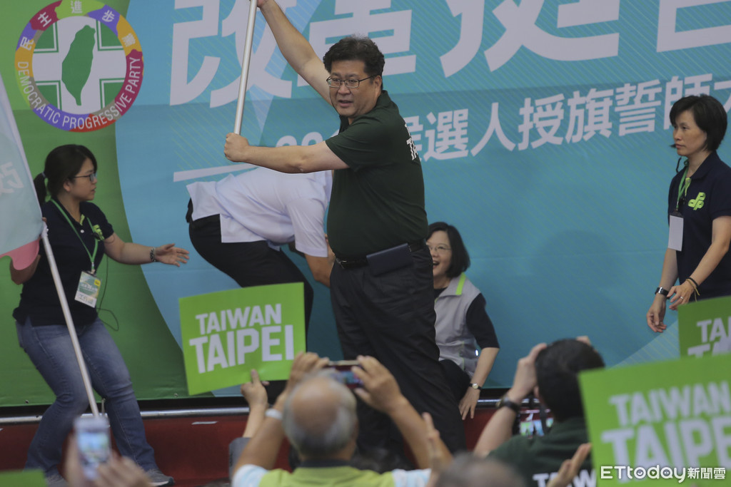 蔡英文先將旗幟一一傳給每個參選人,過程中卻不小心摔了一跤,在授旗給台北市議員林世宗後,卻意外跌坐舞台上,姚文智及一旁的國安人員趕緊上前幫忙,但蔡英文仍面帶笑容,並未變臉。