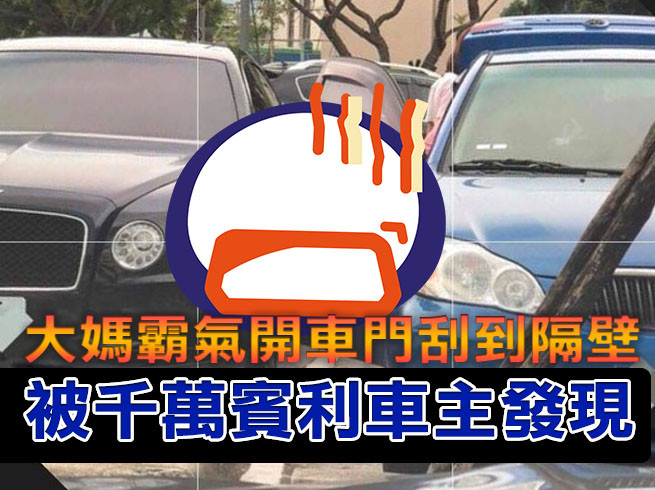 一名女網友5日在內湖好市多戶外停車場,看到一名大嬸霸氣地大開車門,門當場撞上隔壁賓利,之後便揚長而去,對於自己撞到隔壁車門似乎不在意。原PO看了當場直呼「這位大嬸開門也要注意旁邊的車(賓利欸……)啊⋯這樣撞下去……我也好心疼……因為我也常常被撞過。」