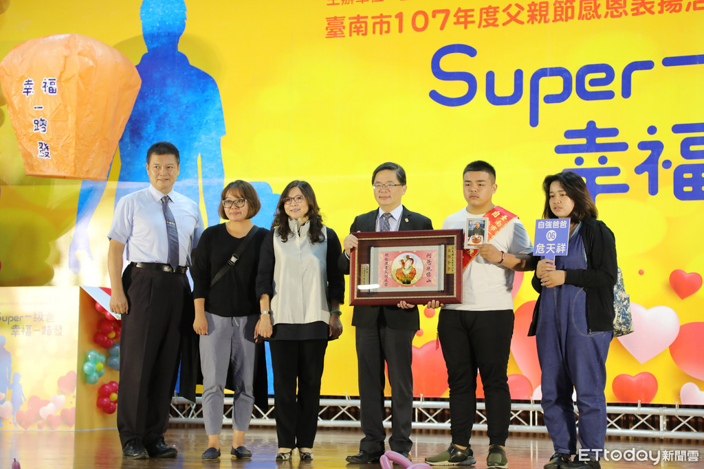 ▲107年度自強爸爸危天祥,因病不幸在今年7月過世,由女兒危心如和次子危震代為出席領獎,由危震捧著爸爸的照片,代表接受台南市代理市長李孟諺頒發獎牌。(圖/台南市政府提供)
