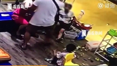 根據《看看新聞Knews》報導,這名7歲男童當時在培訓機構的遊戲區內玩耍,調皮的他用腳推倒了一名女孩搭的積木,站在一旁的女孩父親看到後衝上前去,雙手將男童推倒在地,男童身後的玩具架也被推翻,工作人員趕緊上前查看男童的情况,而女孩的父親則雙手叉腰,不時用手指著男童責罵。
