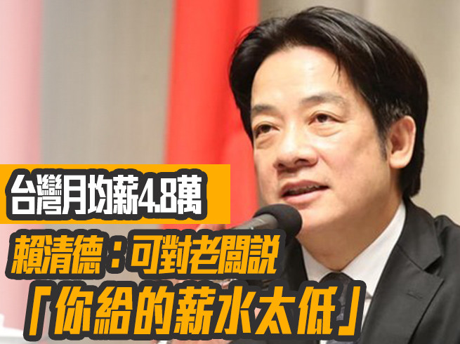 賴清德說,月薪平均4.8萬的數據,「等於是政府跟資方講,你有賺錢啊,那現在的平均總薪資是多少,你不可以給我太低的薪水,它等於是一個行情,跟社會上講行情是怎麼樣,那讓我們的朋友,當他要去談薪資的時候,他有根據可以跟資方據理要求,你給的薪水太低了」。