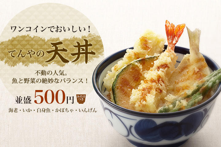 天丼てんや因為價格實惠,深受當地人喜愛,店內一碗招牌天丼只需要500日幣(約台幣137元),用料豐富,內有酥脆的炸蝦、花枝和疏食。除此之外,每個月18號店家還推出特惠價,390日幣的感謝天丼,另外還可以加點套餐、價格超值。