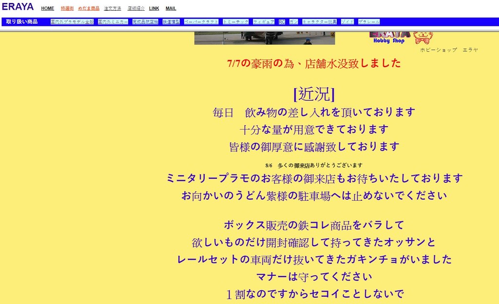 事隔一個月,エラヤ模型店於官方網站宣布,將在6日重新營業,被大雨泡損的模型,將以每件1折優惠價格販售,營業時間為日本時間上午9時至13時。若有喜歡模型、欲要前往西日本地區觀光的遊客,不妨到此地來「尋寶」一下,以及幫助受災店長走出逆境。