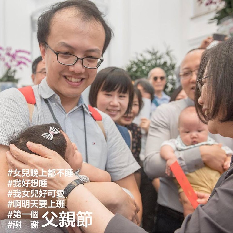 總統府日前舉辦家庭日,許多府內員工帶了家人入府,蔡英文也跟許多年輕家長、小朋友互動。剛好碰上父親節,她也就在臉書上貼出一張當時活動中,一位年輕爸爸抱著熟睡女兒的照片。