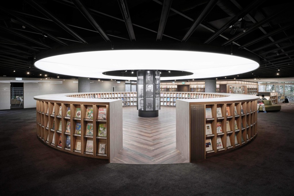 在許偉揚總監的巧思下,三樓期刊閱讀空間建置橢圓廣場,透過弧形意象與書架構成的矩陣動線,勾勒空間的軸線關係。同時,也回應浩然圖書館既有的空間結構,試圖整合大廳入口與期刊區的尺度,連結新舊共存的公共閱讀場域。